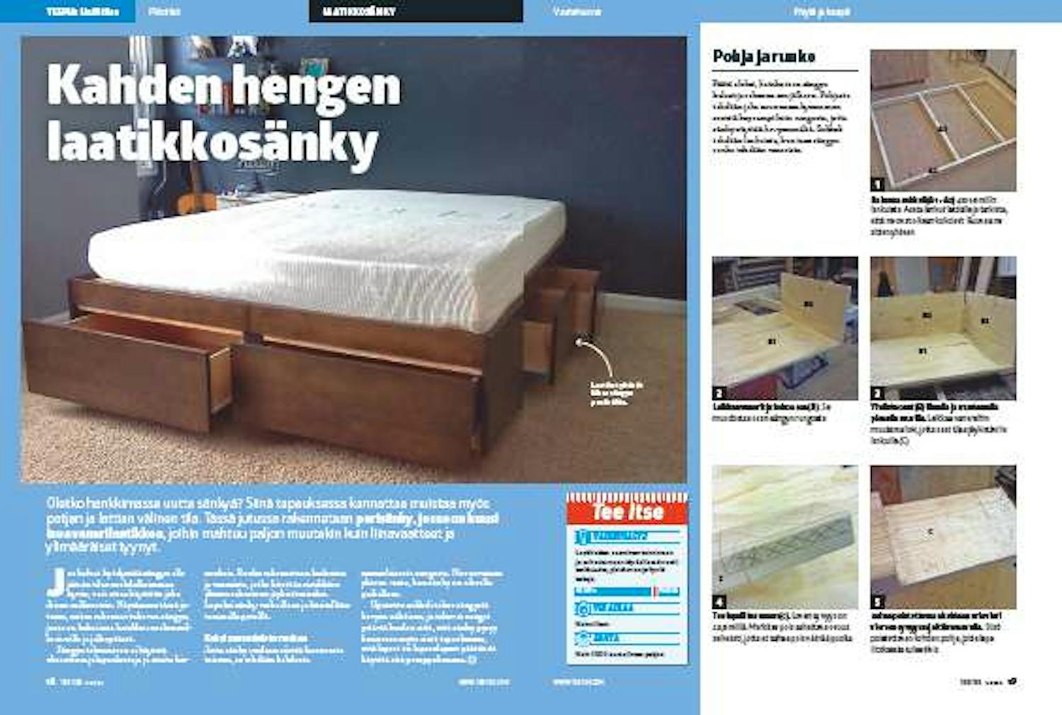 Sängyn alla oleva tila hyödynnetään laatikoilla, joten niistä tehdään mahdollisimman isot ja tukevat. Ne koostuvat neljästä sivusta, jotka tehdään 12 millin vanerista, ja pohjasta, joka tehdään 6 millin vanerista.