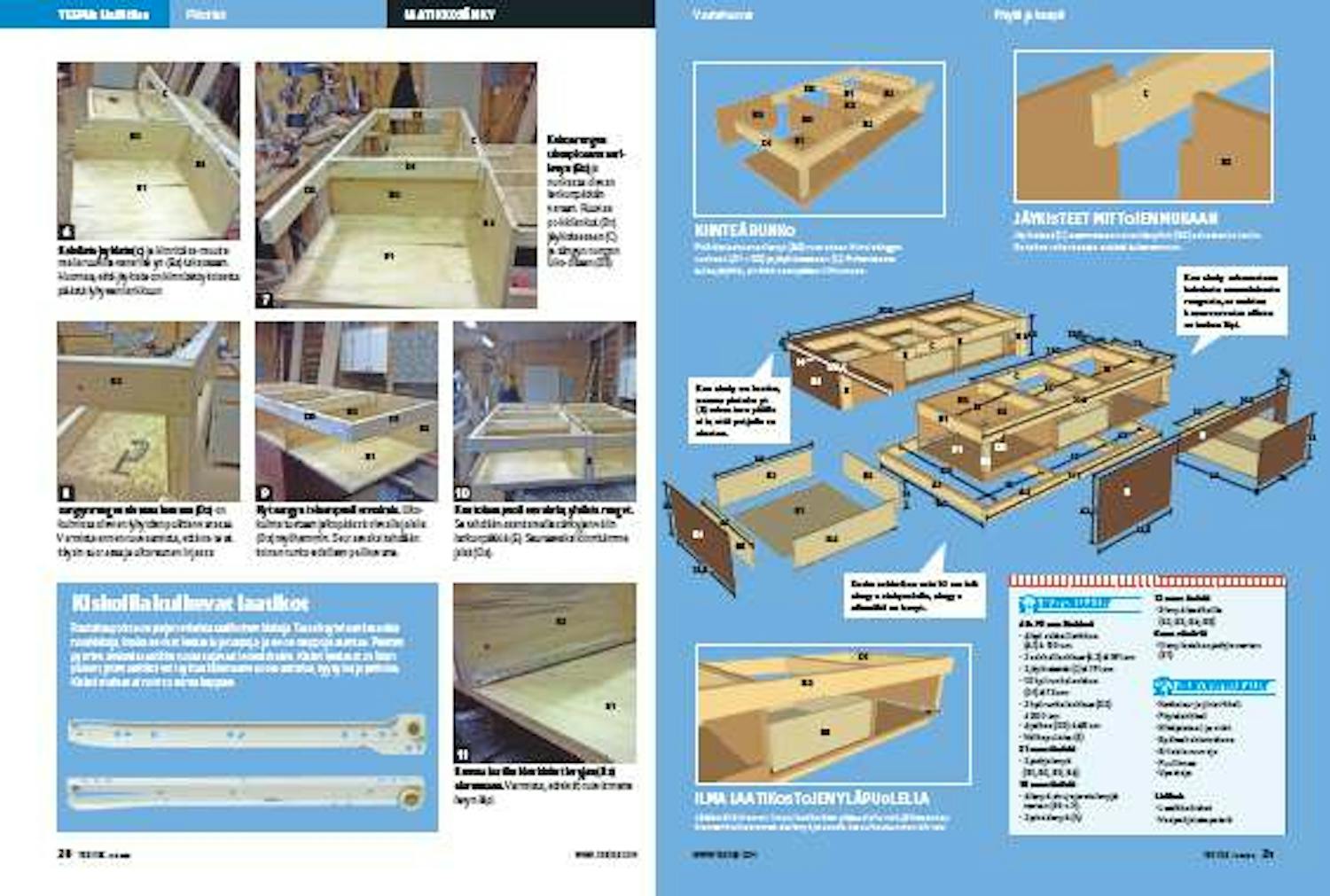 Kolmeen sivuun sahataan 6 millin ura laatikon pohjaa varten. Osat kiinnitetään toisiinsa liimalla ja hakasilla, ja laatikoihin asennetaan kiskot. Kun laatikko on suorakulmainen ja näyttää siltä kuin sen pitääkin, siihen asennetaan ylimääräinen etulevy, jotta laatikko sulkeutuu tiiviisti.