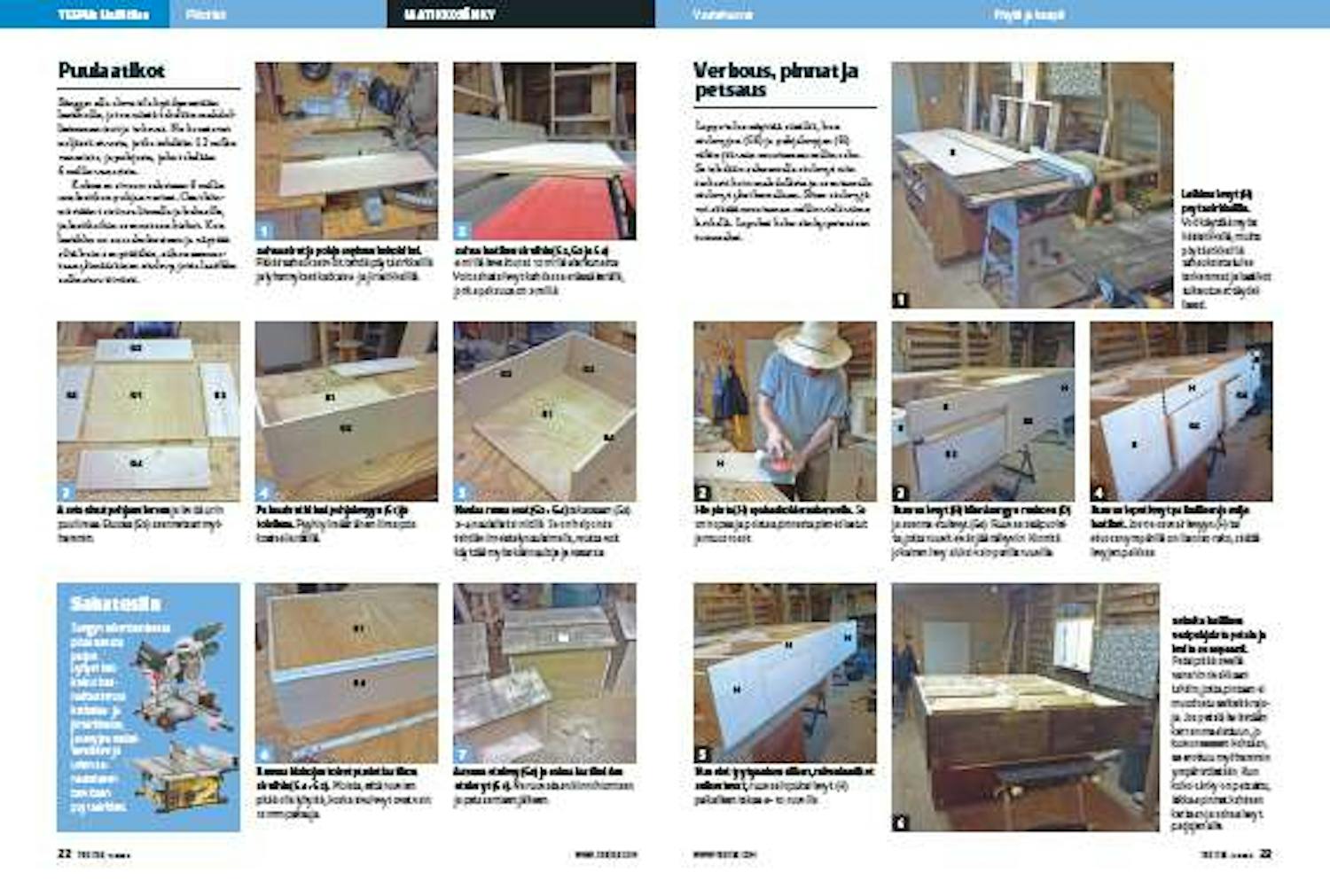 Sahaa sivut ja pohja sopivan kokoisiksi. Pitkät sahaukset voit tehdä pöytäsirkkelillä ja lyhennykset katkaisu- ja jiirisirkkelillä.