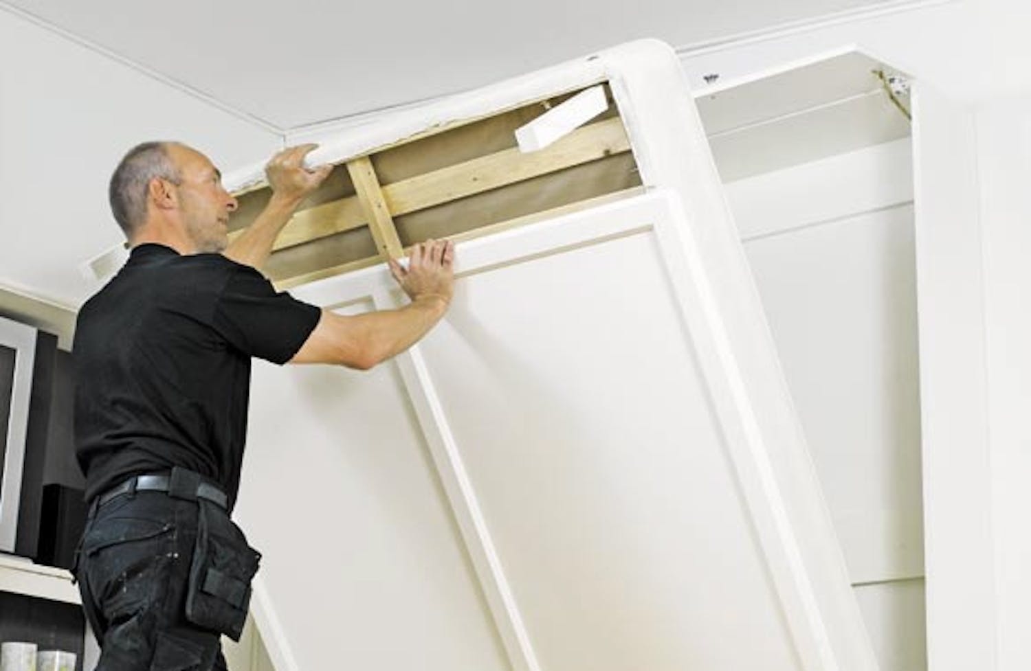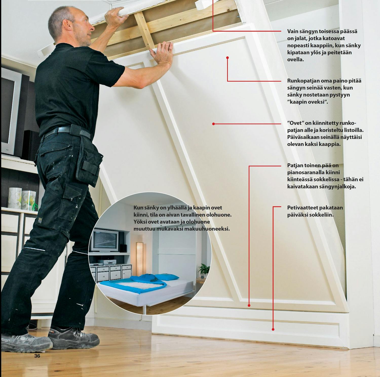 Kaappi sovitetaan tiiviisti seinää vasten. Seinien alareunassa on usein jalkalistat, jonka vuoksi sivukappaleiden takareunan alaosaan täytyy leikata lovi, johon jalkalista ”uppoaa”, kun sänky nostetaan ylös seinälle.