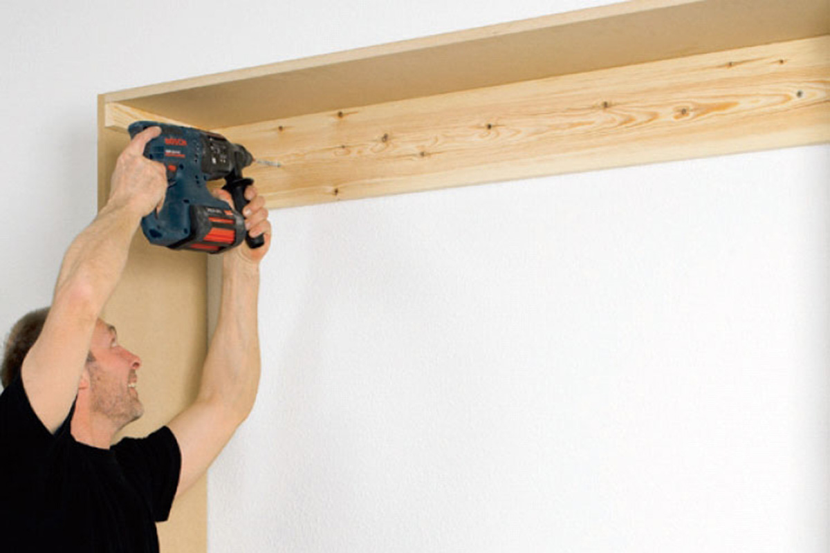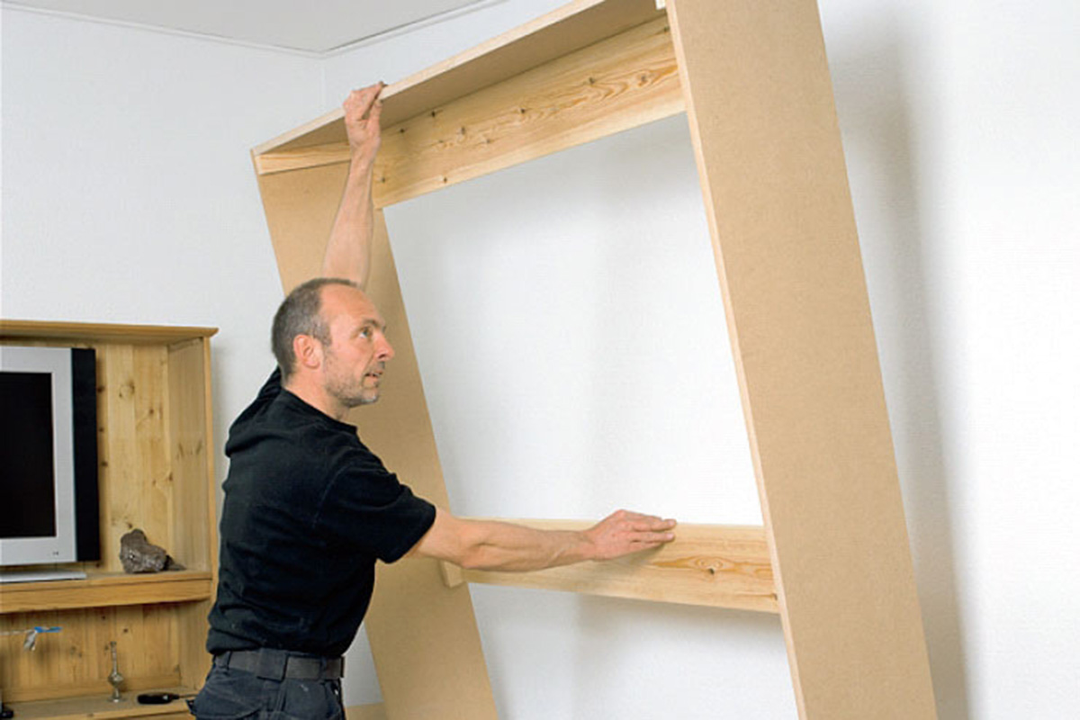 MDF-levystä valmistetut sivut ja mäntypuiset vahvistuslistat sahataan mittoihin etukäteen. Mitat sovitetaan huoneen mittoihin, jalkalistoihin jne.