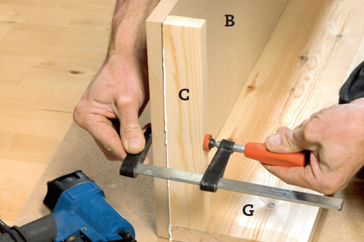 Nurkkalistat (C) kiinnitetään ylimmäiseen levyyn vahvistamaan kiinnitystä sivukappaleisiin (A). Listaan sivellään liimaa ja se nostetaan pystyyn ja pidetään naulauksen aikana paikallaan ruuvipuristimella.