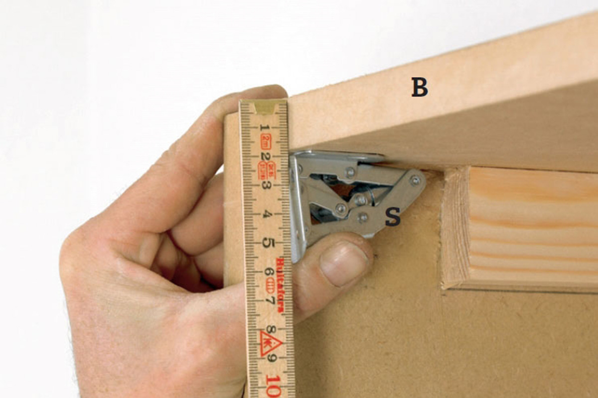 Ylin kaapinovi (L) kääntyy ylä-levystä (B) kolmen tai neljän piilo-tetun jousisaranan (S) avulla. Ne ruuvataan ensin oveen, mutta sitä ennen on otettava mitat, jotta saranat tulevat niin alas oveen, että se peittää ylimmän levyn reunan.