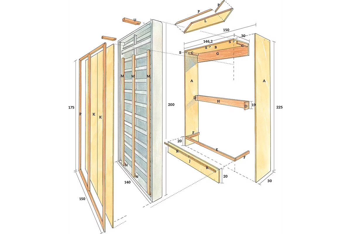 Kaapin mitat määräytyvät sen vuoksi runkopatjan mittojen mukaan. Lue seuraavilta sivuilta kuinka kaappi rakennetaan 140 x 200 cm:n patjalle.