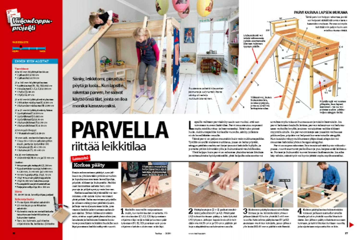 Pienet pöytälevyt vakauttavat parvea, mutta ensisijaisesti ne toki toimivat pöy-tinä. Niiden korkeus määritellään parven asukkaiden mukaan. Koska kantavat listat on liimattu pöytälevyjen alle ja vain ruuvattu kiinni pääty- ja sivulautoi-hin, pöydän korkeutta on helppo muuttaa lasten kasvaessa.