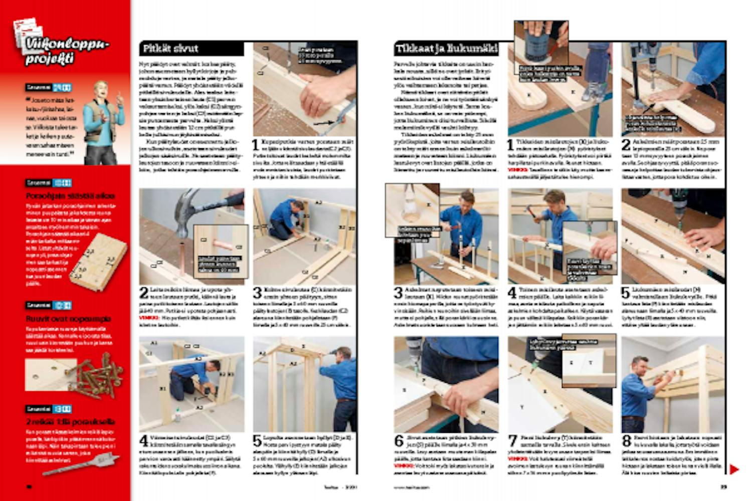 Katkaisusahaa käyttämällä voi var-mistaa, että osista tulee varmasti yhtä pitkät. Saha asetetaan pöydälle ja oikean etäisyyden päähän (esim. jalkoja varten) asetetaan kiila, jota vasten kaikki jalat tuetaan sahauk-sen ajaksi. Sitten kiilaa siirretään niin, että se sopii päätylautoihin jne. Laudasta ja kahdesta listasta koostuva poraohjain tehdään huolella: sen läpi porataan kaikki näkyvät ruuvit.