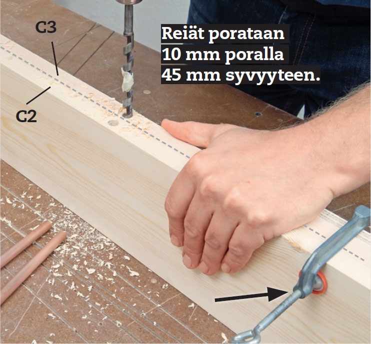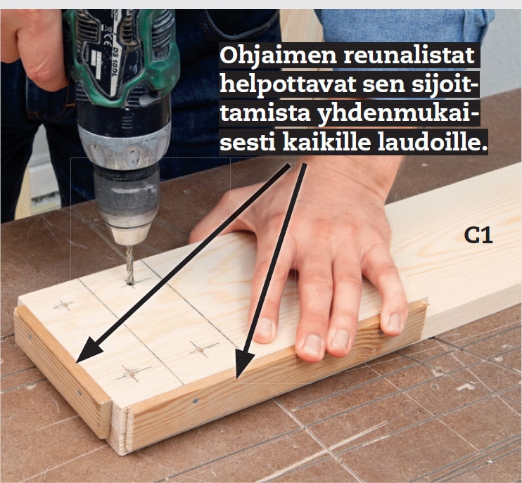 Kaikille ruuveille esiporataan reiät, kun kaikki laudat on sahattu. Vii-den sivulaudan (C1, C2, C3) läpi porataan ohjaimen läpi neljä reikää ja kuuteen pää-tylautaan (B1, B2, B3) porataan vain pora-ohjaimen kahden uloimman reiän läpi.