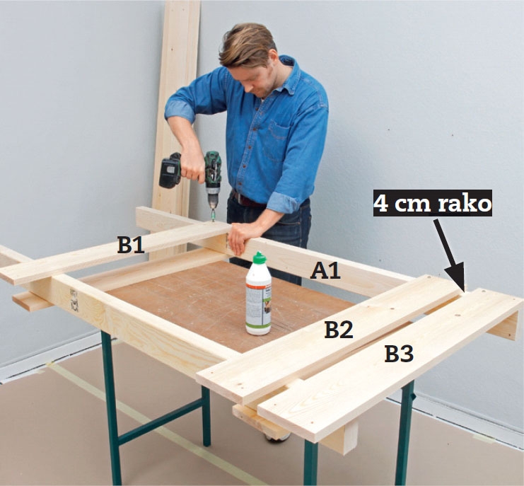Kolmeen päätylautaan sivellään liimaa ja ne kiinnitetään yhteen jalkaan (tässä A1) kukin yhdellä 5 x 60 mm ruuvilla. Kaksi alinta päätylautaa (B1 ja B2) asetetaan merkkien kohdalle, ja sen jälkeen ylin lauta (B3) 40 mm:n päähän edellisestä.