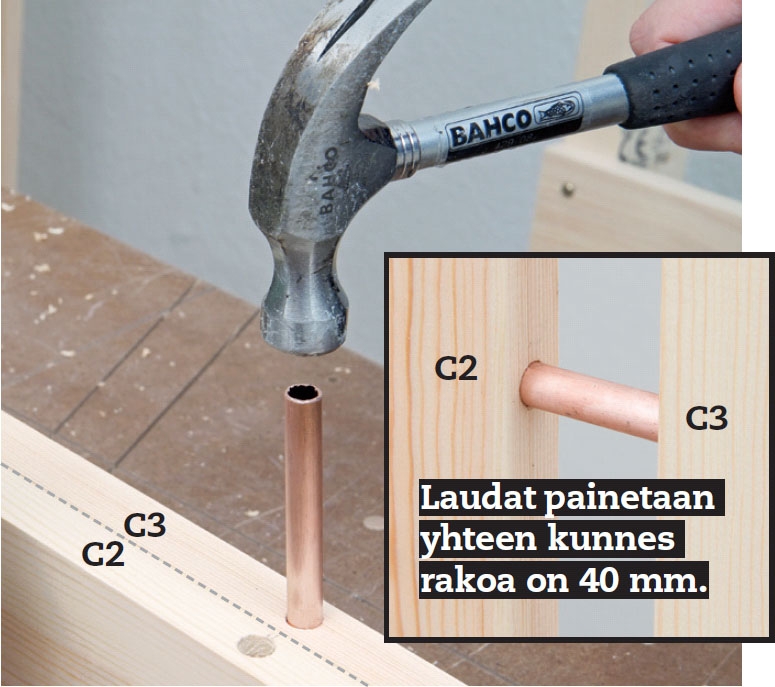 Kupariputkia varten porataan reiät neljään viidestä sivulaudasta (C2 ja C3). Putket sitovat laudat keskeltä molemmilta sivuilta. Jotta reiät saadaan yhtä etäällä molemmista sivuista, laudat puristetaan yhteen ja niihin tehdään merkkiviivat.