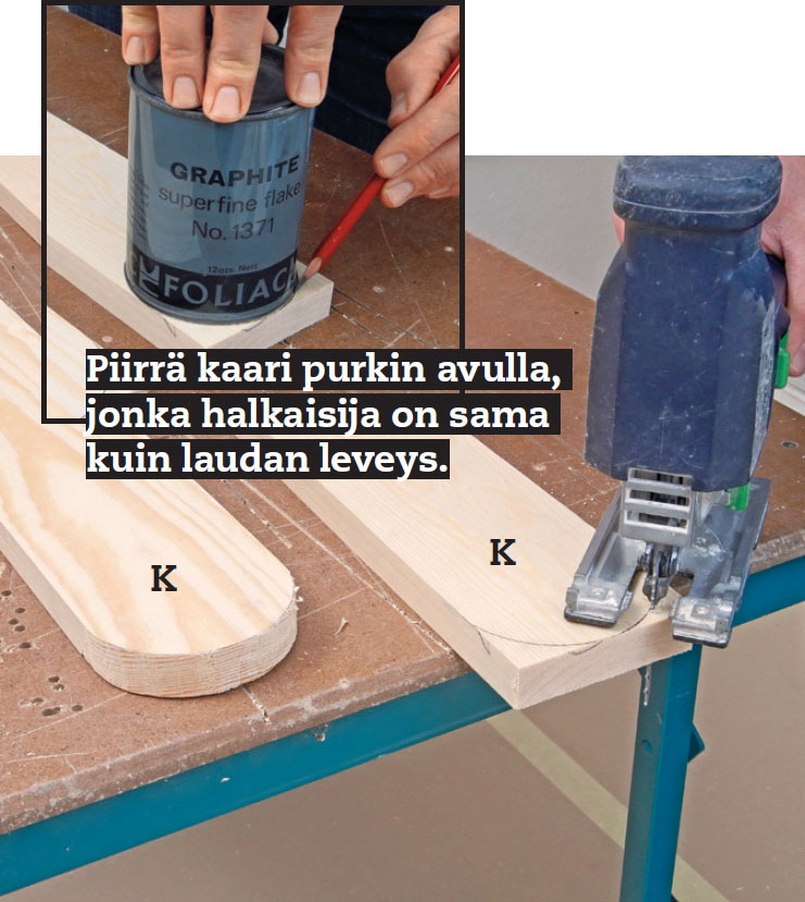 Tikkaiden reisilautojen (K) ja liuku-mäen reisilautojen (N) pyöristykset tehdään pistosahalla. Pyöristykset voi piirtää harpilla tai purkin avulla. Reunat hiotaan.