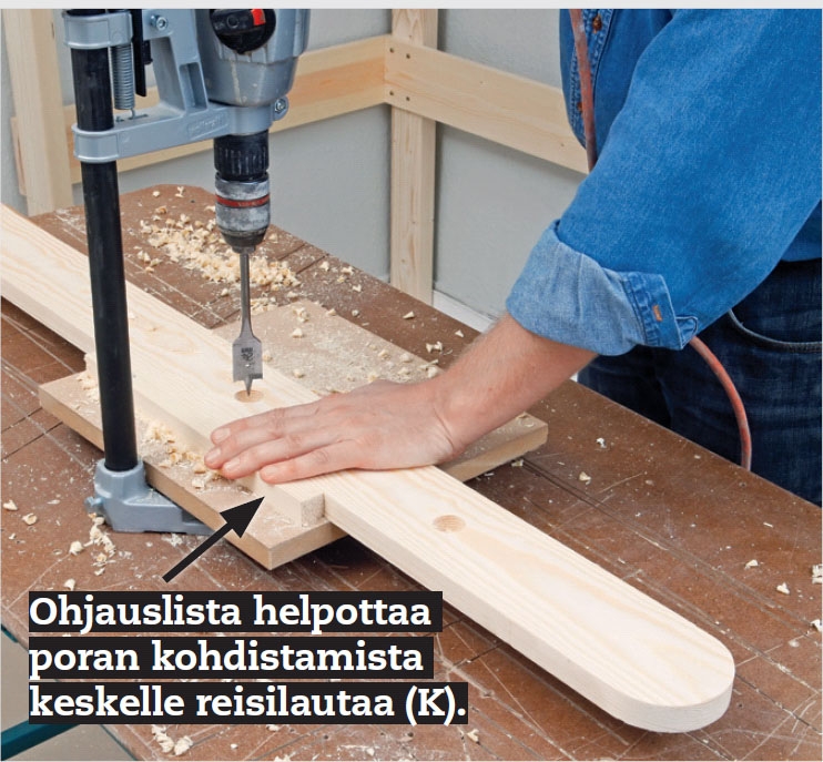 Askelmat naputetaan toiseen reisi-lautaan (K). Niiden reunat pyöristetään ensin hiomapaperilla, jotta ne työntyvät hy-vin sisään. Reikien reunoihin sivellään liimaa, mutta ei pohjalle, sillä porankärki osuu sinne. Askelmat suoristetaan suoraan kulmaan heti.