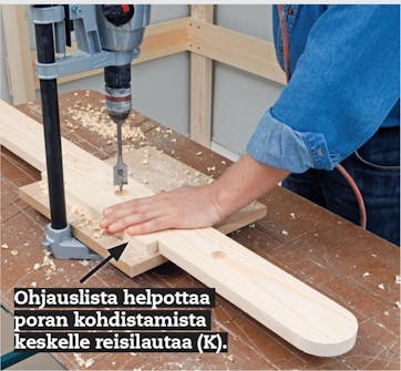 Askelmien reiät porataan 25 mm lapioporalla 25 cm välein. Ne pora-taan 15 mm syvyyteen poraohjaimen avulla. Se ohjaa syvyyttä, pitää poran suorassa ja helpottaa laudan tukemista ohjaus-listaa vasten, jotta pora kohdistuu oikein.