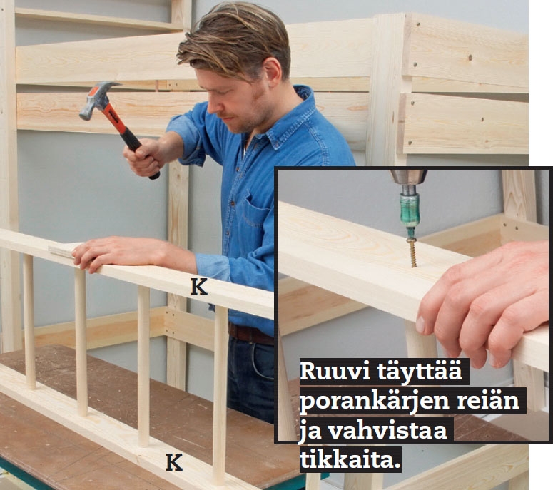 Toinen reisilauta asetetaan askel-mien päälle. Laita kaikkiin reikiin liimaa, aseta reisilauta paikoilleen ja naputa askelmien kohdalta paikalleen. Käytä vasaran ja puun välissä kiilapalaa. Kaikkiin porankär-jen jättämiin reikiin laitetaan 5 x 40 mm ruuvi.