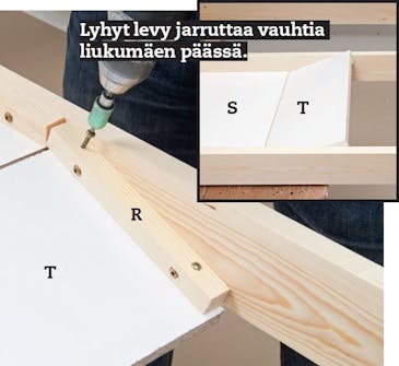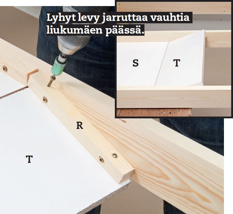 Sivut asetetaan pitkien liukulevy-jen (S) päälle liimalla ja 4 x 30 mm ruuveilla. Levy asetaan muutaman kiilapalan päälle, jotta kantava lista saadaan kiinni. VINKKI: Voit toki myös lakata sivut ensin ja asentaa levyt vasta seuraavana päivänä.