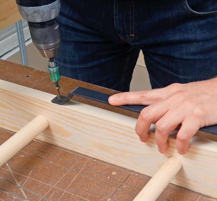 Kun päätylaudat on asennettu jalko-jen ulkosivuihin, asetetaan sivulaudat jalkojen sisäsivuille. Ne saatetaan pääty-lautojen tasoon ja ruuvataan kiinni rei-kiin, jotka tehtiin poraohjaimen avulla.