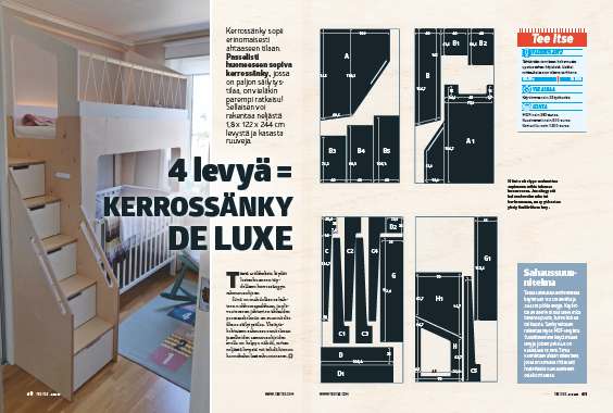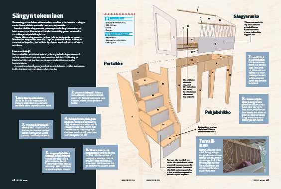 Lopuksi tehdään sängynrunko, johon myös pohjalevyä kannattelevat listat asennetaan. Kun kaikki päämoduulit on tehty, jatka ruuvaamalla portaikko ja pohjakehikko yhteen.