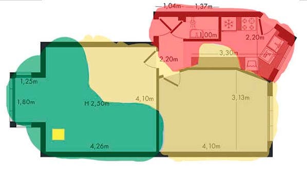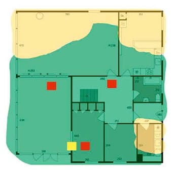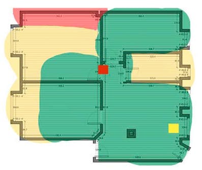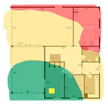 Tässä asunnossa reitittimen ja yhden huoneen välissä on kaksi kantavaa seinää. Signaali kauimmaisessa huoneessa on huono, mutta ongelma ratkaistiin vahvistimella.