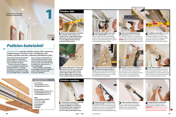 Kotelon mitat saa selville nivelmitalla ja vesivaa’alla. Putkien alapinta ei ole vaakasuora, joten mittaa useasta kohdasta, jotta putket varmasti mahtuvat koteloon koko pituudeltaan. Muista varata tilaa myös mahdollisille lampuille.