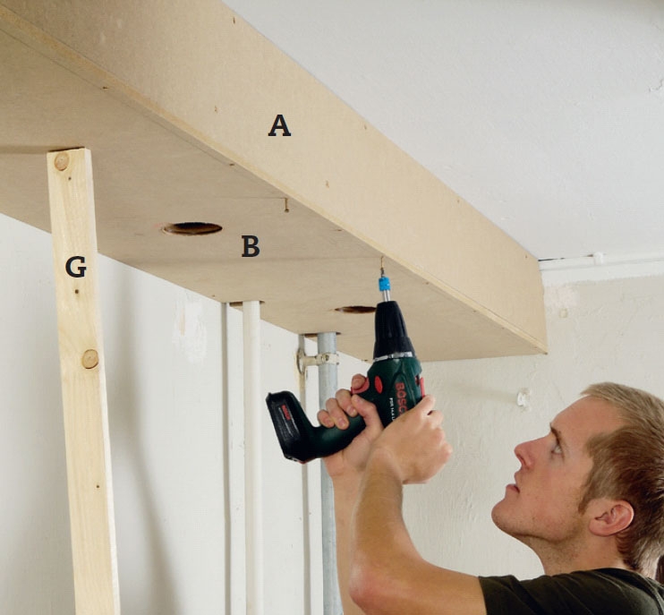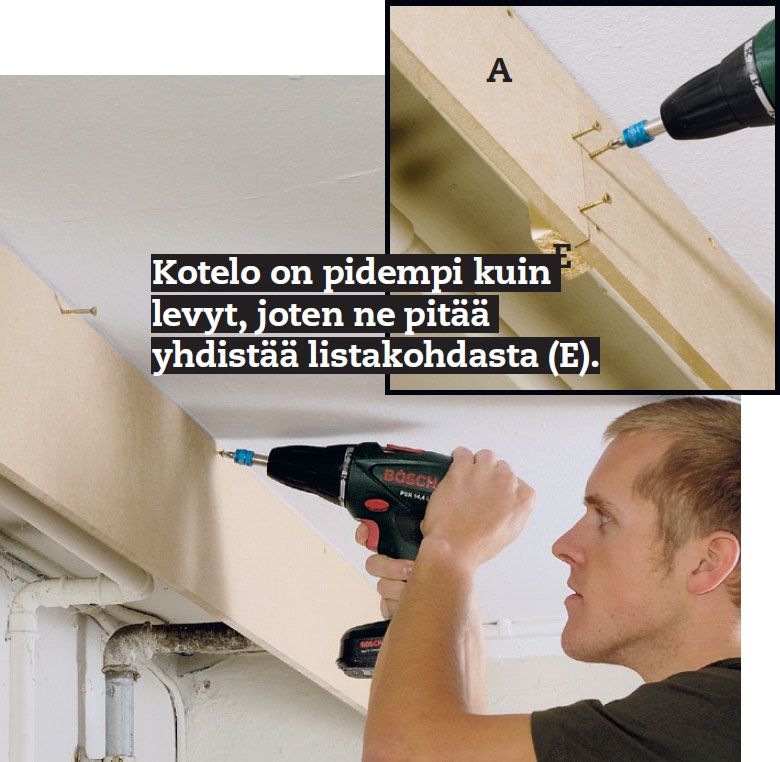 Lista (C), jonka päälle etulevy (A) tulee, kiinnitetään kattoon. Listan etureuna asetetaan niin, että putkille jää kotelossa tilaa. Levyjä ei leikata vielä, sillä jos listoja on hankala kiinnittää kattoon, voimme joutua säätämään listojen paikkaa.
