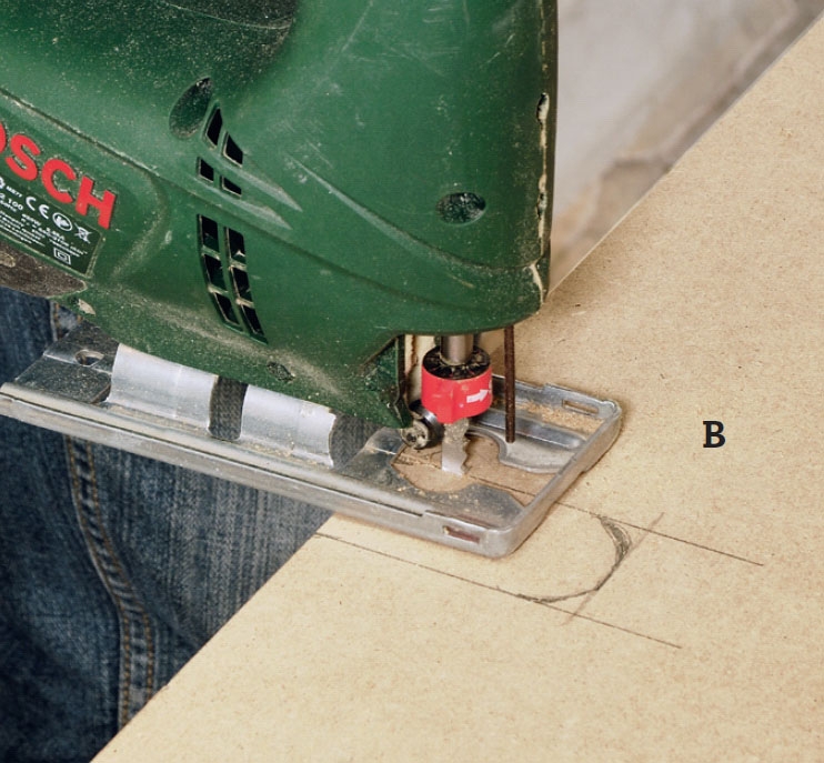 Pohjalevy (B) sahataan. Koska seinät ovat harvoin suorat, on varminta ottaa mitat etulevyn pystyreunasta seinään ja mitata useasta kohdasta ennen kuin leikkaa levyn. Mittaa putkien ja johtojen läpi-vientien paikat ja leikkaa aukot pistosahalla.