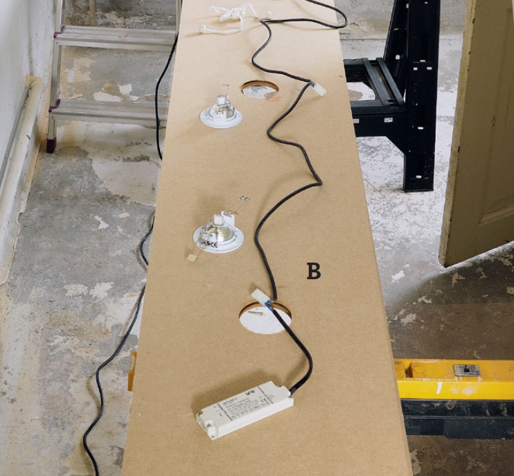 Mdf-levyt sopivat hyvin tähän työhön: ne ovat vakaita, kevyitä ja helposti leikattavia, ja lisäksi ne voi maalata. Kiinnitämme ne ruuvaamalla ensin seinään ja kattoon pari 24 x 45 mm:n listaa. Levyt kiinnitetään listoihin. Uudet vaakapinnat on helppo varustaa halogeenilampuilla. Valmislamppusarja on paras valinta, jos tiedät, mihin haluat asentaa lamput pysyvästi. Voit asentaa itse myös muuntajan siten, että lamppuihin on helppo päästä käsiksi.
