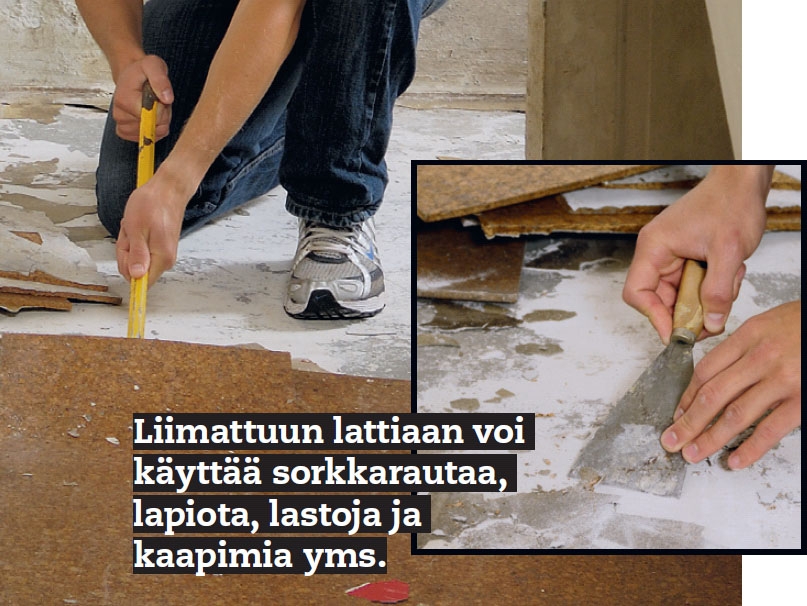 Vanhat korkkilaatat poistetaan. Tässä kohteessa se sujuu hyvin. Useimmat laatat irtoavat työntämällä niiden alle sorkkarauta. Korkin jäänteitä joudutaan kaapimaan irti lastalla ja vasaralla vain muutamasta kohdasta.