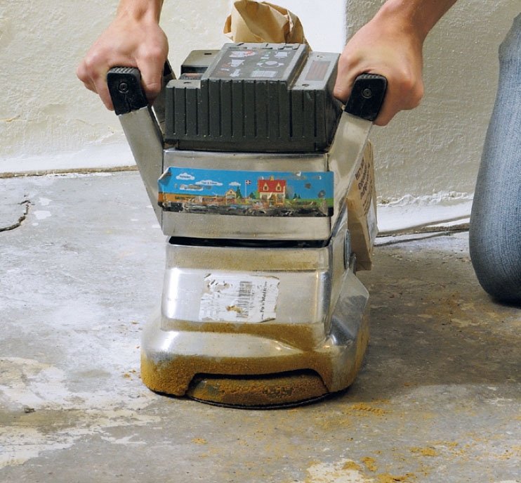 Viimeiset nyppylät hiotaan tai kaavitaan irti. Koska talosta löytyi reunahiomakone portaiden hiontaa varten, käytimme sitä ja hioimme lattian tasaiseksi. Kohoumat voi hioa myös puupalan ympärille kierretyllä hiomapaperilla.
