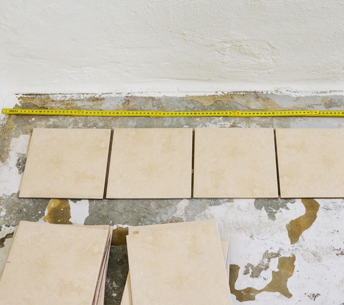 Aseta rivi laattoja irralleen huo-neen pituuteen ja leveyteen, kun lattia on sileä ja kuiva. Kokeile, miten laatat asettuvat parhaiten ja hukkapaloja jää vähi-ten. Useimmiten halutaan saada yhtä leveät laatat vastakkaisille reunoille, mutta ei aina.