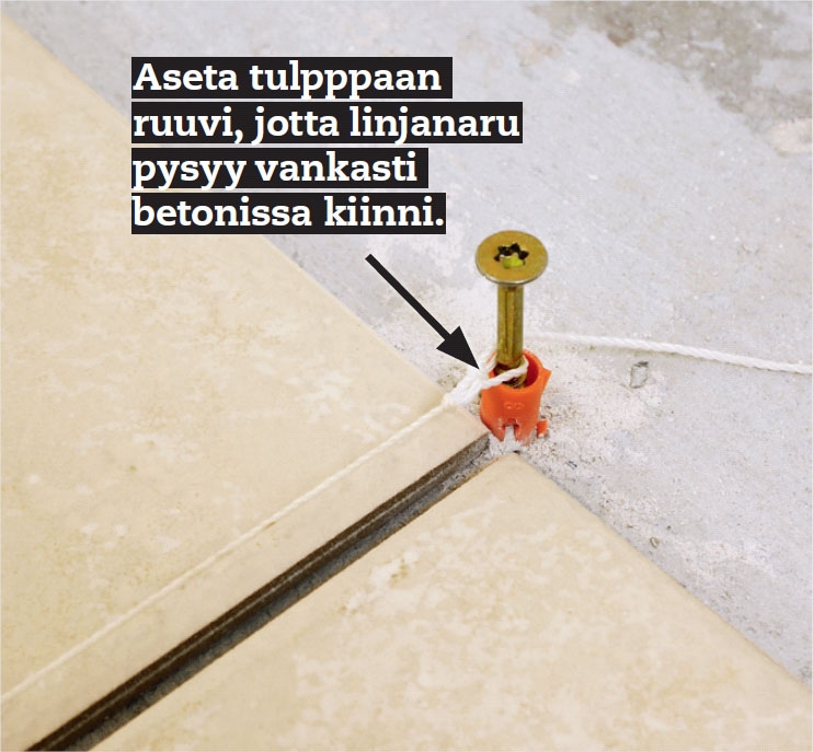 Merkitse ensimmäisen laattarivin paikka ja kiristä tähän naru linja-merkiksi. Kannattaa aloittaa keskeltä - siellä kohdassa laatat näkyvät eniten, ja sieltä ulospäin siirtyvät mahdolliset epätasaisuu-det eivät pysty kasvamaan liian laajoiksi.