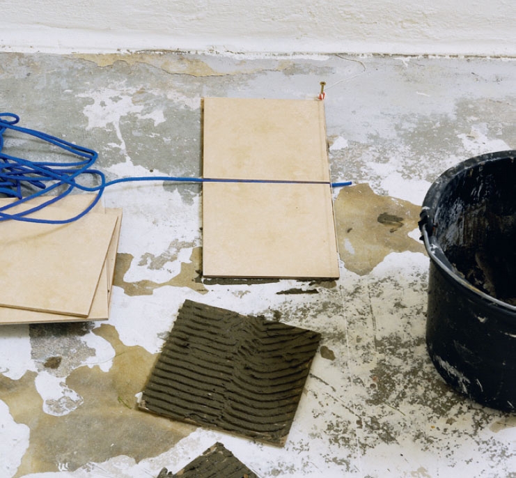 Tämänkokoiset laatat vaativat tasaisen alustan. Kun vanhat laatat ja liimanjäänteet oli poistettu, riitti, että oikaisimme lattiaa muutamasta kohdin, ja selvisimme työstä itsetasoittuvalla lattiatasoitteella. Jos olisimme rakentaneet kelluvan lat-tian, meidän olisi pitänyt levittää tätä kallista tasoitetta koko lattiapintaan, jotta lattia ei narisisi ohuemmista tasoi-tekohdista. Nyt pystyimme jatkamaan suoraan laattakiinnitteellä.