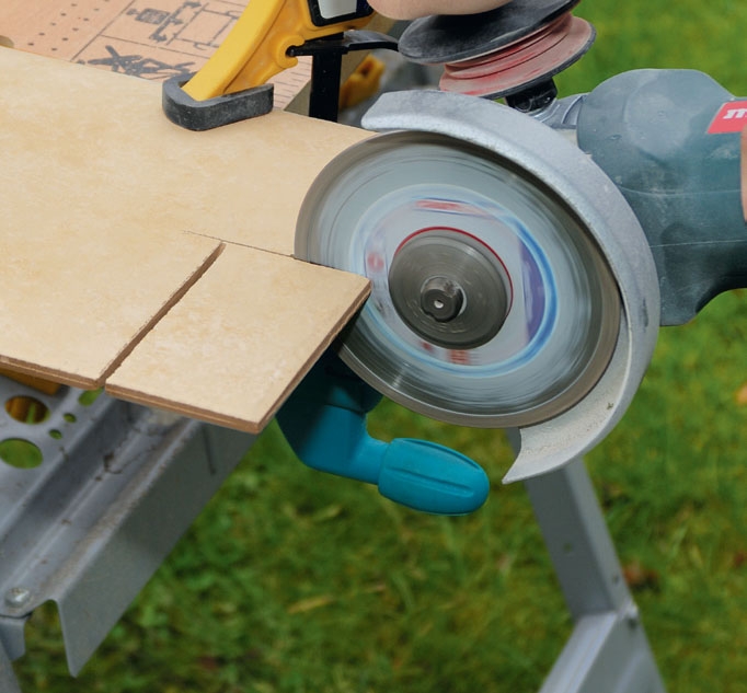 Kulman ympärille tulevat laatat on helppo leikata kulmahiomakoneella. Tämä on parasta tehdä ulkona, jotta koko kellari ei täyty pölystä.