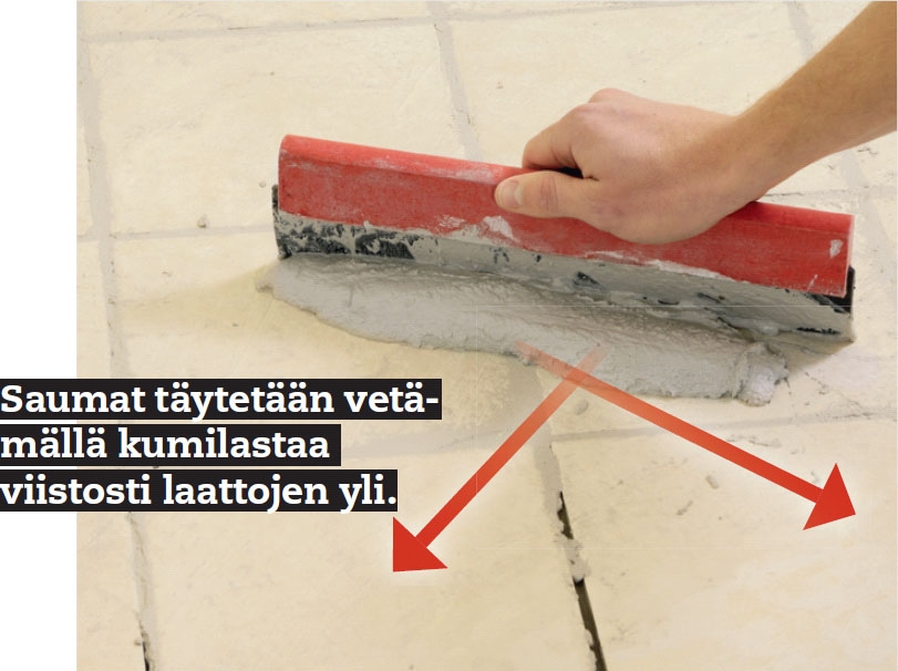 Laatat saumataan saumamassalla, kun laasti on ehtinyt kovettua noin vuo-rokauden. Saumamassa (tässä on valittu vaalea hiekanväri) työstetään saumoihin levittämällä sitä viistosti laattojen yli. Saumat pitää saada täyteen massaa.