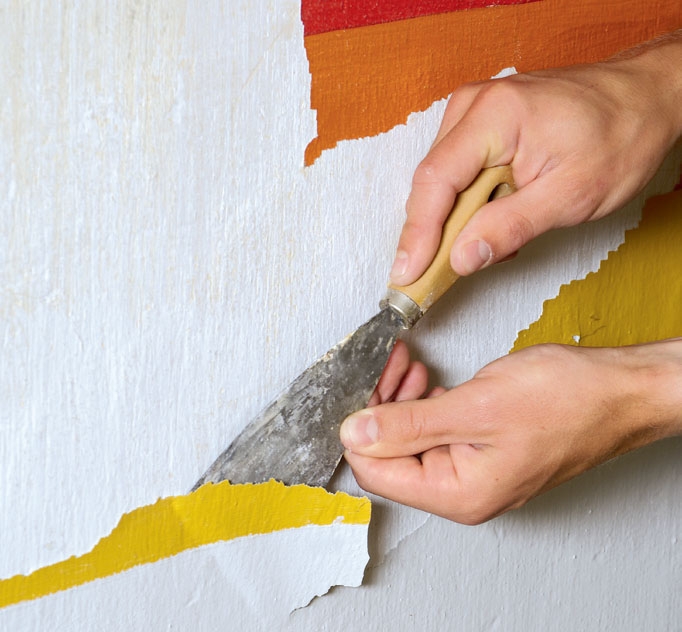 Seinistä kaavitaan irtomaali pois. Muovimaalit voi kaapia isoina pintoina, mutta osassa seinää muovimaali oli vedetty kalkkipintaan. Oli vain yksi ratkaisu: poistaa maalikerros ja ryhtyä sen jälkeen kalkkipinnan käsittelyyn.