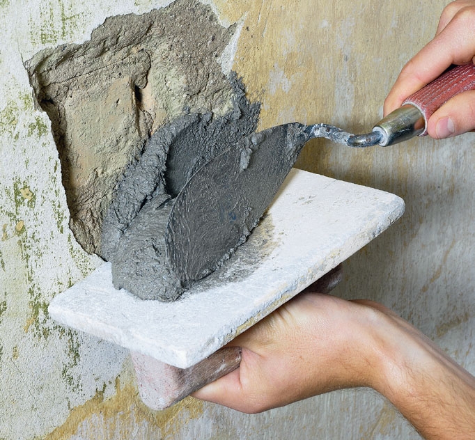 Joitakin pieniä reikiä täytetään korjauslaastilla. Alue kostutetaan roiskimalla korjattavaan kohtaan harjalla hieman vettä ennen kuin laasti painetaan paikalleen. Kaikki rikkonaiset seinäpinnat kaavitaan puhtaiksi irtoaineksesta.