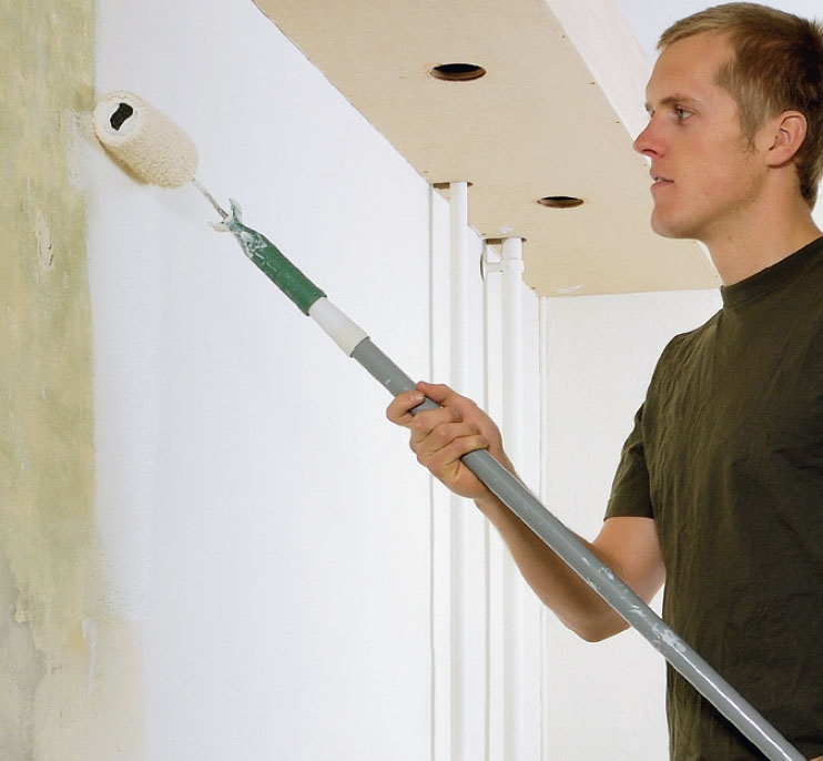 Katto maalataan aivan ensimmäi-seksi - siis ennen lattian ja putkien kotelointia. Näin pintoja ei tarvitse suojata. Irtomaali kaavitaan irti ja vauriot tasoite-taan. Pitkän varren päähän kiinnitetyllä telalla työ sujuu kätevästi.