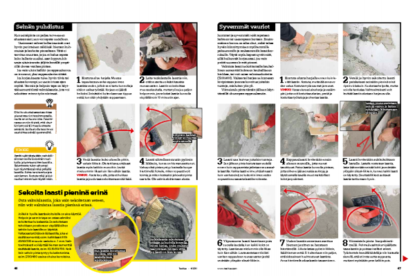 Jos korjauksesta tulee hyvin tiivis tai alustaa kovempi, se usein irtoaa ajan myötä. Varmin ja helpoin tapa on käyt-tää sementitöntä valmislaastia, jota voi sekoittaa veteen työn edetessä.