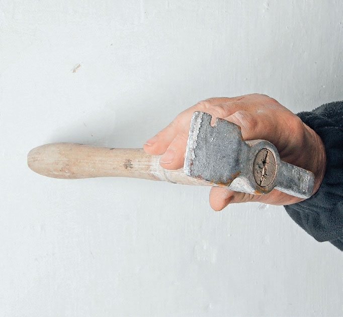 Naputtele varovasti vasaran varrella seinään, niin kuulet selvästi, missä ontot ja kiinteät kohdat ovat. Nyt voit mer-kitä ne kohdat, joissa rappaus on irti. Paina käsi seinää vasten: jos käteen tarttuu kalk-kia, kalkki voidaan usein sitoa kalkkivedellä.