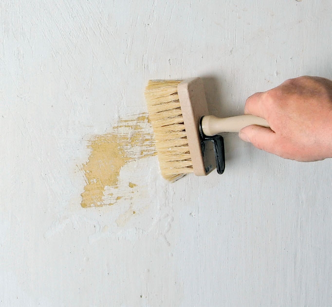 Porakoneen teräsharjalla saa irrotettua liian tiiviin maalikerroksen. Se pölyää paljon, joten suojaa itsesi ja huoneen muut pinnat jo etukäteen. Isot pinnat saa työstettyä nopeasti käyttämällä karkeaa hiomapaperia (karkeusaste 24).
