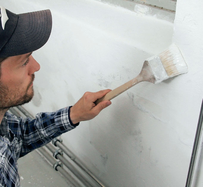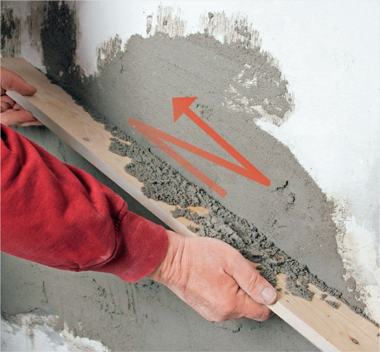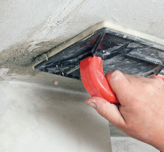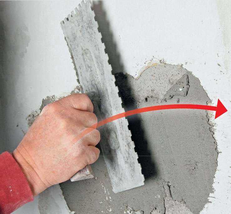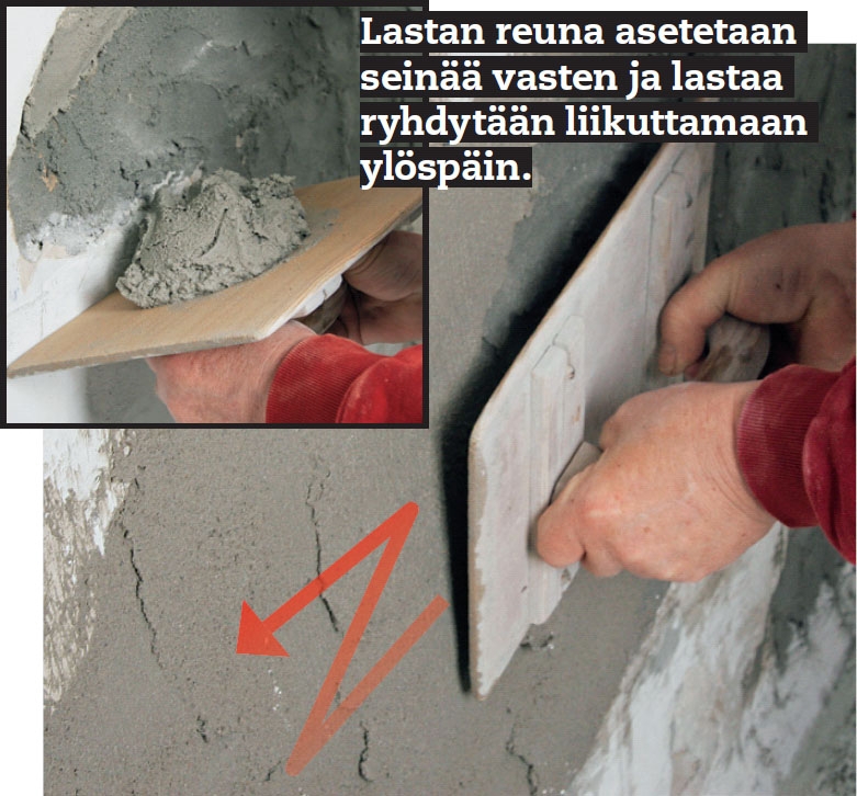 Vetelä ja hyvin sekoitettu laasti paiskataan seinään pieninä erinä ripein viskaisuin. Kuulostaa helpolta, mutta voi olla hankalaa. Vaihtoehtoisesti voit levittää laastin alustaan harjan avulla.