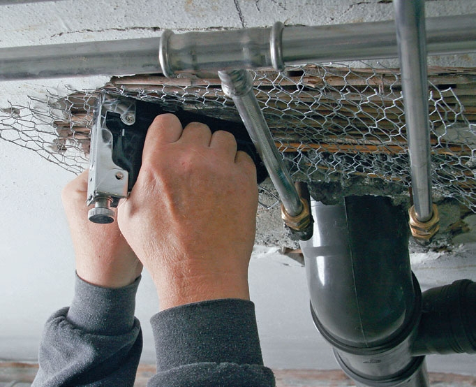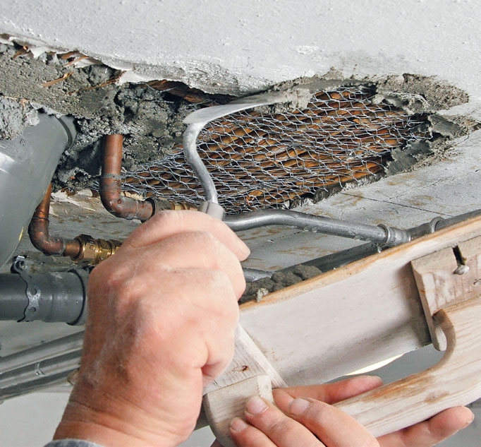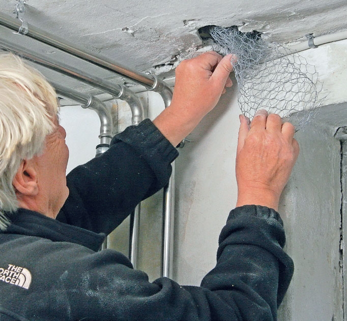 Kanaverkkoa taivutellaan ja muotoillaan niin, että sen voi painaa katossa olevaan reikään laastin kiinnittämiseksi. Käytä pienireikäistä kanaverkkoa ja leikkaa siitä sopivia paloja sivuleikkureilla.