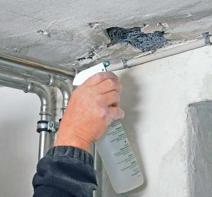 Reikä kostutetaan vedellä, kun verkko on hyvin paikallaan. Varmista, että vettä tulee kaikille sivuille. Katto-pinnalla laasti ei voi jäädä roikkumaan jatkotyöstämistä varten, jos vesi imeytyy laastista nopeasti pois.