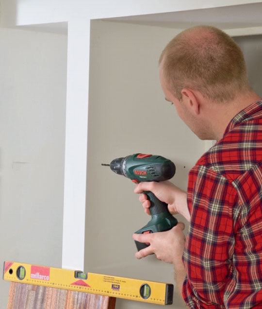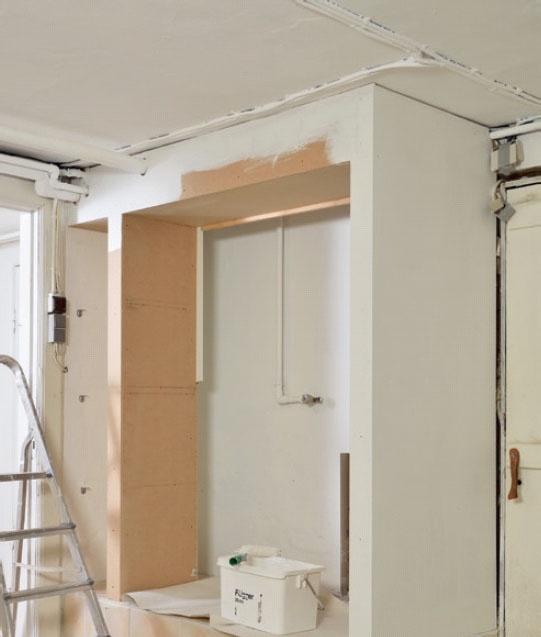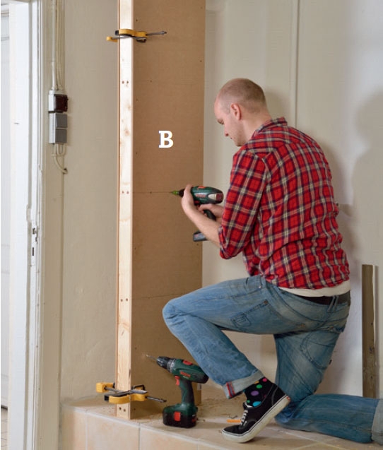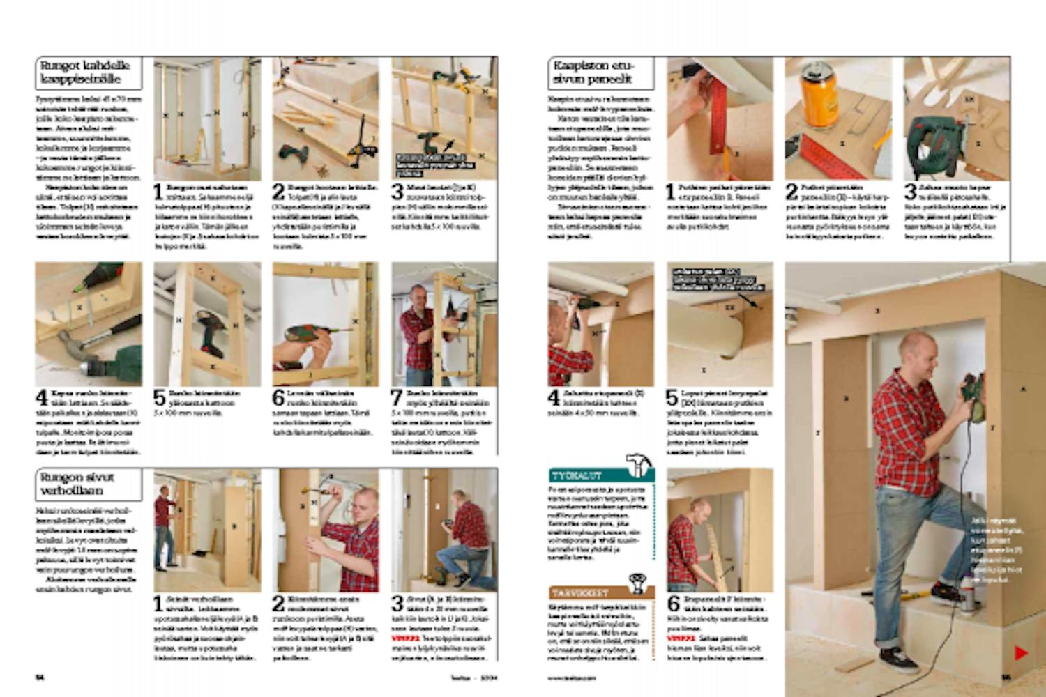 Kaksi runkoseinää verhoil-laan sileillä levyillä, jotka myöhemmin maalataan val-koisiksi. Levyt ovat ohuita mdf-levyjä: 10 mm on sopiva paksuus, sillä levyt toimivat vain puurungon verhoiluna.
