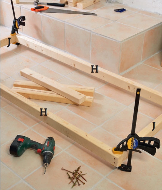 Rungot kootaan lattialla. Tolpat (H) ja alin lauta (K kapealla seinällä ja J leveällä seinällä) asetetaan lattialle, yhdistetään puristimilla ja kootaan kulmista 5 x 100 mm ruuveilla.