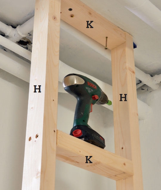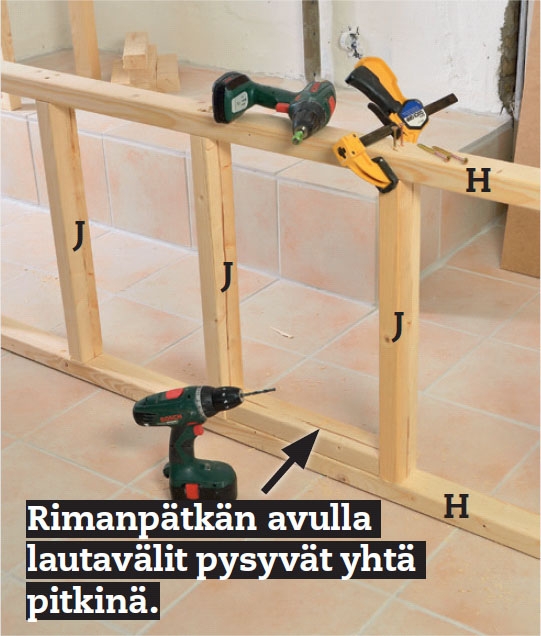 Rungon osat sahataan mittaan. Sahaamme neljä kulmatolppaa (H) pituuteen ja kiilaamme ne kiinni korokkeen ja katon väliin. Tämän jälkeen lautojen (K ja J) sahauskohdat on helppo merkitä.