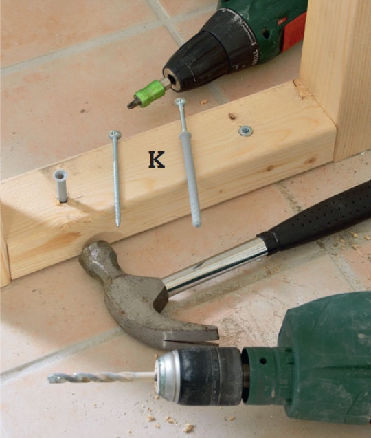 Kapea runko kiinnite-tään lattiaan. Se sääde-tään paikalleen ja alalautaan (K) esiporataan reiät kahdelle karmi-tulpalle. Monitoimipora poraa puuta ja laattaa. Reiät imuroi-daan ja karmitulpat kiinnitetään.