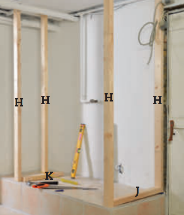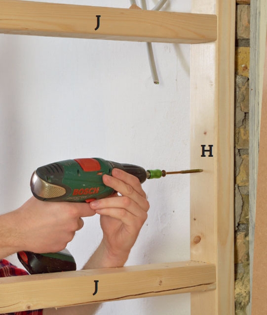 Muut laudat (J ja K) ruuvataan kiinni tolp-pien (H) väliin molemmilla sei-nillä. Kiinnitämme kaikki liitokset kahdella 5 x 100 ruuvilla.