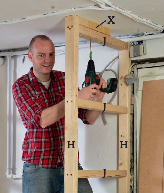 Pystytämme kaksi 45 x 70 mm soiroista tehtävää runkoa, joille koko kaapisto rakennetaan. Aivan aluksi mit-taamme, suunnittelemme, kokeilemme ja korjaamme - ja vasta tämän jälkeen kokoamme rungot ja kiinni-tämme ne lattiaan ja kattoon.