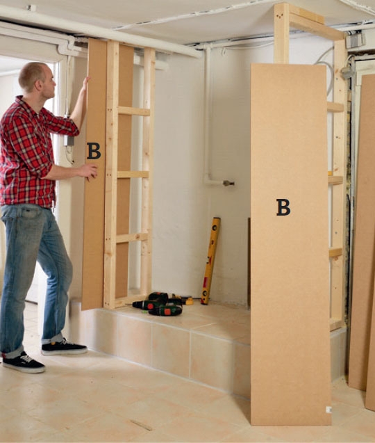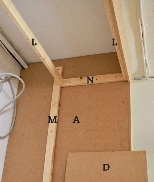 Kaapistossa on nyt kapea tila kellarinseinustalla ja leveä kahden uuden seinän välissä. Kapea tila katetaan kiinteällä takaseinällä, mutta leveä tila pidetään avoimena kahden koneen takana. Koneiden ja leveiden hyllyjen päällä oleva taustaverhoilu pitää voida poistaa helposti, jotta putkiin ja johtoihin päästään käsiksi. Nyt luomme kehyksen kaapiston irrallista taustalevyä varten (pois lukien takaseinä ja leveän seinän katto).