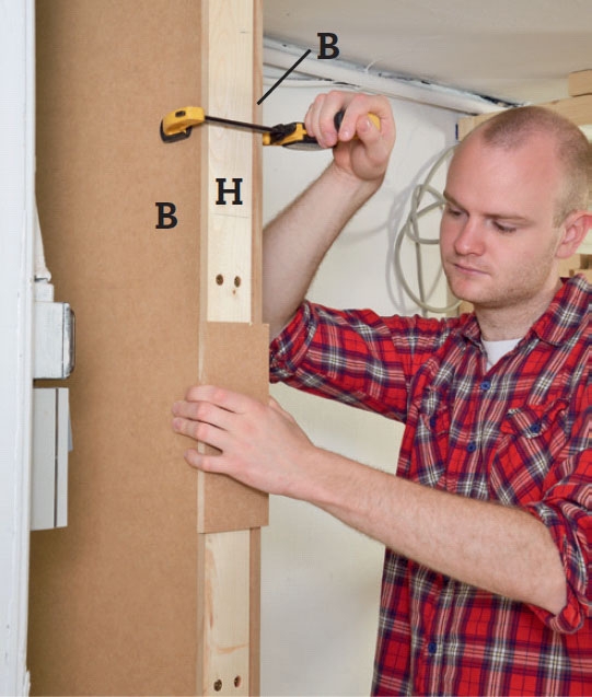 Kiinnitämme ensin molemmat sivut runkoon puristimilla. Aseta mdf-levypala tolppaa (H) vasten, niin voit tukea levyjä (A ja B) sitä vasten ja saat ne tarkasti paikoilleen.
