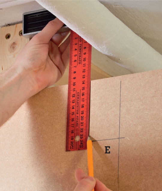 Putkien paikat piirretään etupaneeliin E. Paneeli nostetaan kattoa kohti ja siihen merkitään suorakulmaimen avulla putkikohdat.